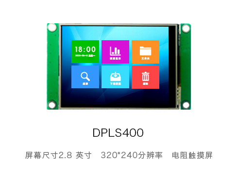 DPLS400 是一款串口显示模组,显示像素分辨率为 320*240(高*宽),屏幕尺寸为 2.8 寸,电阻触摸。 本模组支持使用 kGUIshop 快速设计 GUI 界面,并通过一组 3.3V USART 接口进行数据下载。用户只需 要通过 USART 接口,即可与 GUI 界面进行通信,完成界面的逻辑控制工作。DPLS400 的数据接口加入了 两层静电防护,以适用于更复杂的环境。